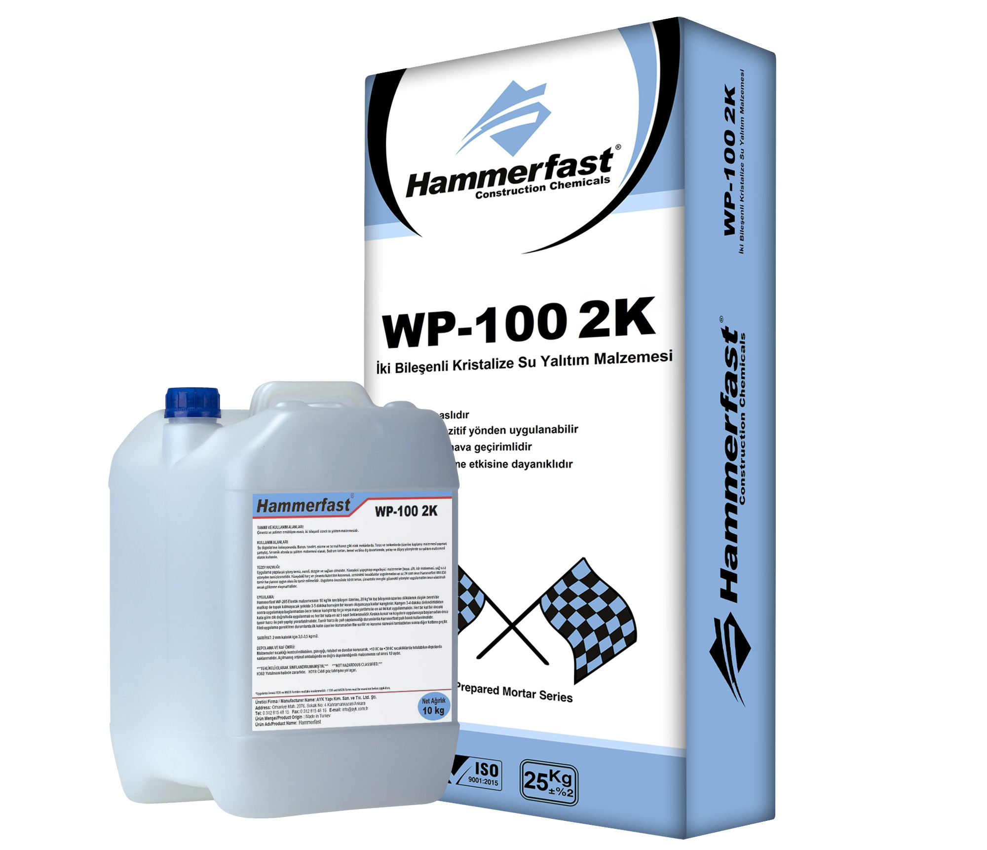 Çimento esaslı, polimer emülsiyon modifiyeli, negatif ve pozitif su basıncına dayanıklı, beton içindeki kapiler boşluklarda kristallenerek bariyer oluşturan, çift bileşenli esnek kristalize su yalıtım harcı.